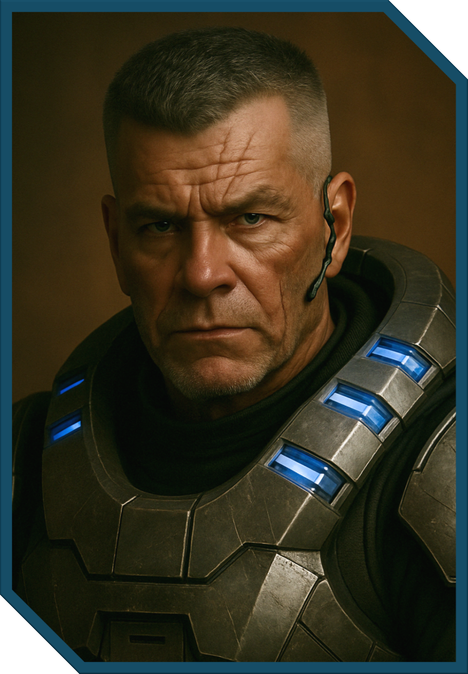 Physical Description | A powerful and incredibly well-built man - particularly for his age - Zrad Rezer looks as if chiselled from stone, and is entirely designed for heavy-duty warfare. His musculature is dense and his face only lightly-scarred (save for three long scratches, courtesy of a vornskyr), given Zrad is a man who has managed to avoid taking too many hits. With thick arms that can move boulders and strong, broad shoulders, Zrad Rezer is perfectly suited to manning heavy weaponry and machinery, as well as wearing heavy armour. |