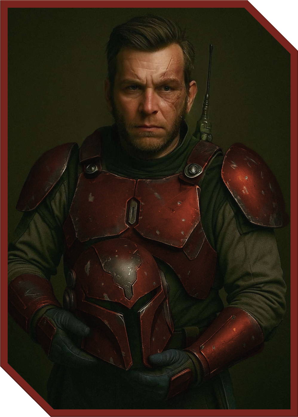 Physical Description | Standing just above average height, Klav Thurn is densely-muscled and walks with purpose. A man who does not smile easily, Klav rarely removes his helmet to expose his face anyway. Were he to do so, rough mutton chops that meet across his jaw can be seen, with a deep scars and plasma burns courtesy of years of combat decorating the left side of his face. ![]() |