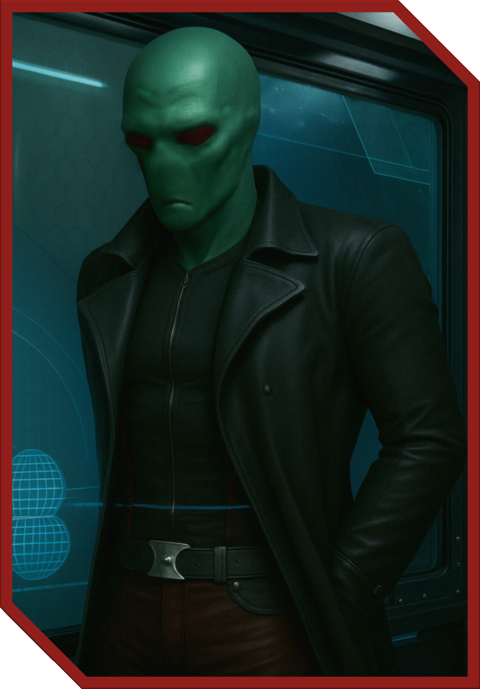 Physical Description | Damask Hul is tall by Duros standards, with a rangy appearance and brilliant red eyes that betray the cunning and resourceful nature of the mind behind them. His green skin is smooth, giving Hul the appearance of a man younger than his fifty-five years of age, although he has a heavy, thoughtful brow that scowls with contempt and easy cynicism. | |