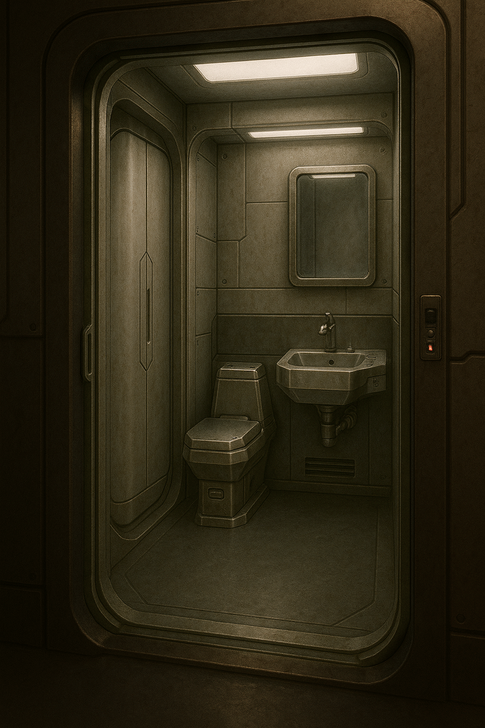 These small rooms house basic sanitation functions, including a sonic sink and shower as well as a toilet. The whole unit is self-cleaning on a regular schedule. There are two refreshers on the ship, both accessible via the Recreation room.