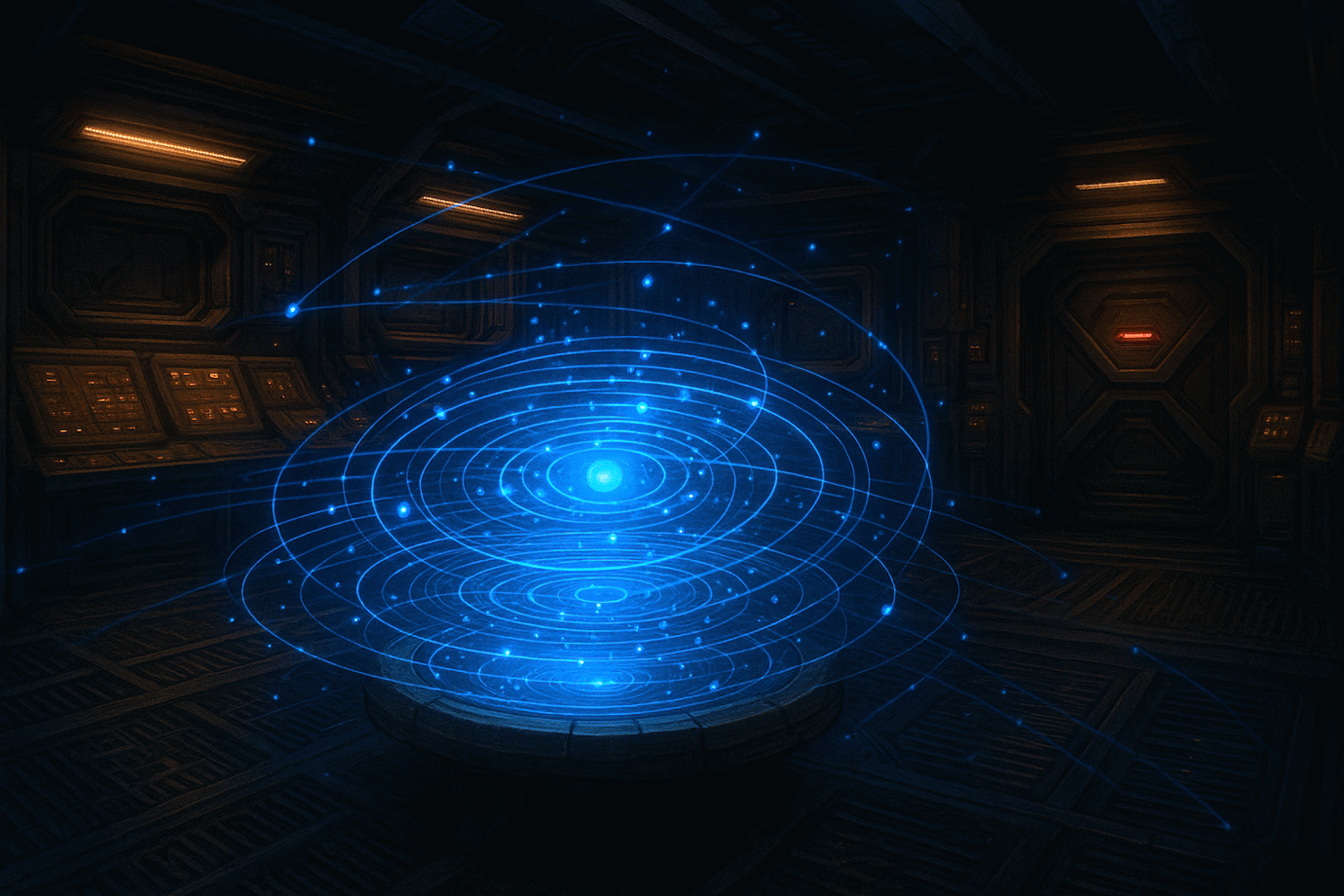 This cargo hold has been converted into a strategy room, housing a large holoprojector that can be used for secure communications across the entire HoloNet as well as other channels. It can also display data, such as galactic and local maps. There is a tactical console in the room that is used for securely encrypting and decrypting outbound and inbound data.