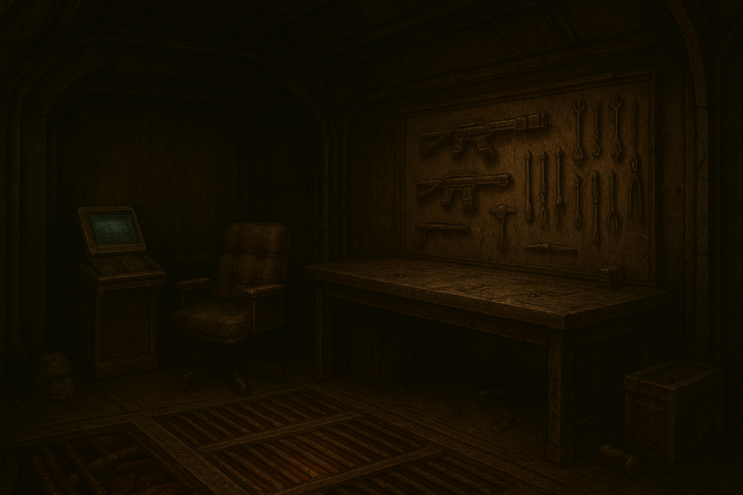 This cargo hold was converted by the Mandalorian Sev Rezer to act as a workshop and armoury to house and repair weapon and armour, largely for himself but could also be turned to lightsaber or droid repair as required.