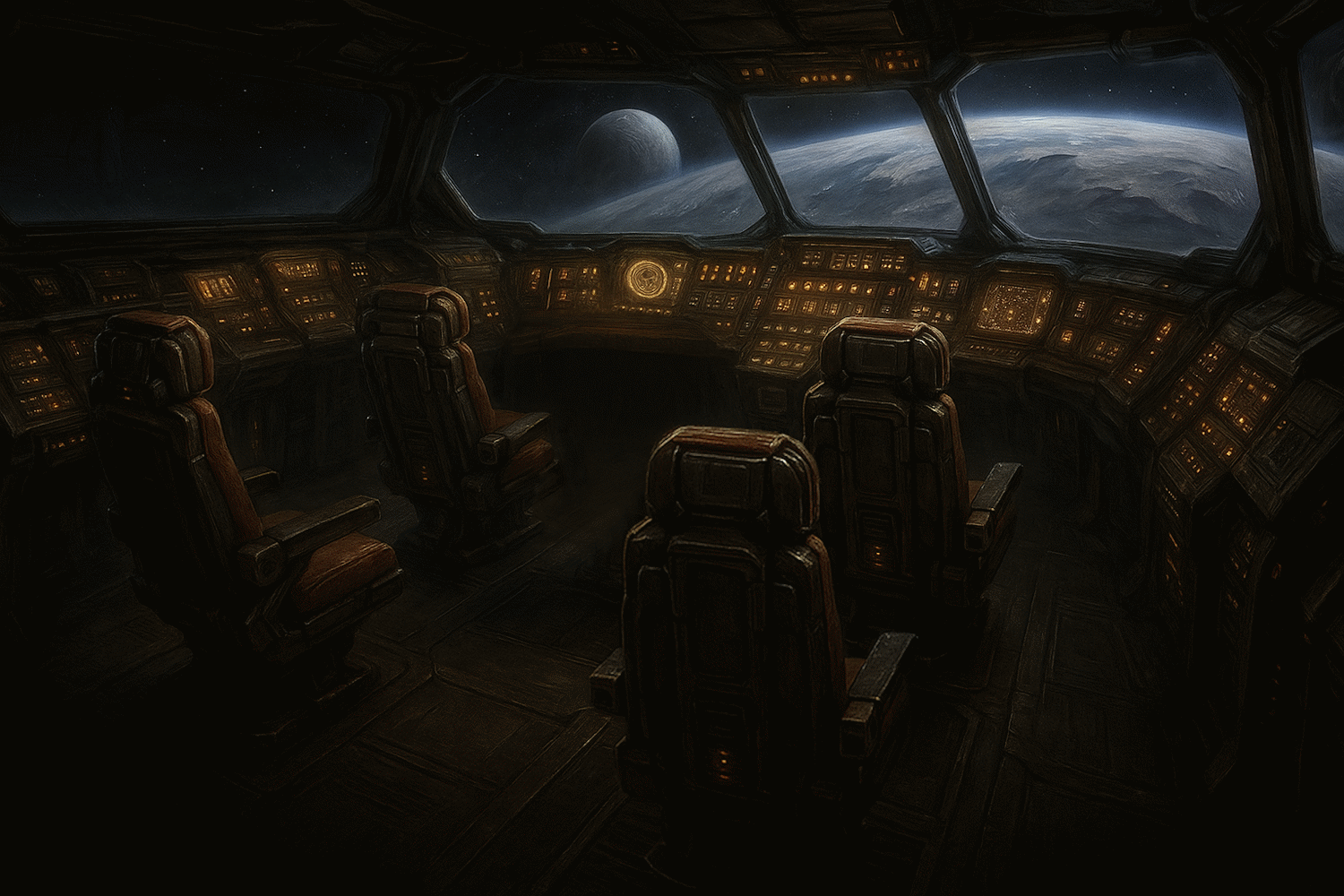 The main flight-centre of the ship and also housing the passenger entry ramp into the vessel. The controls have been heavily upgraded over the years to now include some holographic displays alongside the analogue buttons and levers. While the ship can be manned by a single pilot, there is a co-pilot seat as well as two other passenger/flight assistant chairs. Adjacent to the cockpit is the Navicomputer and the Pilot's cabin.