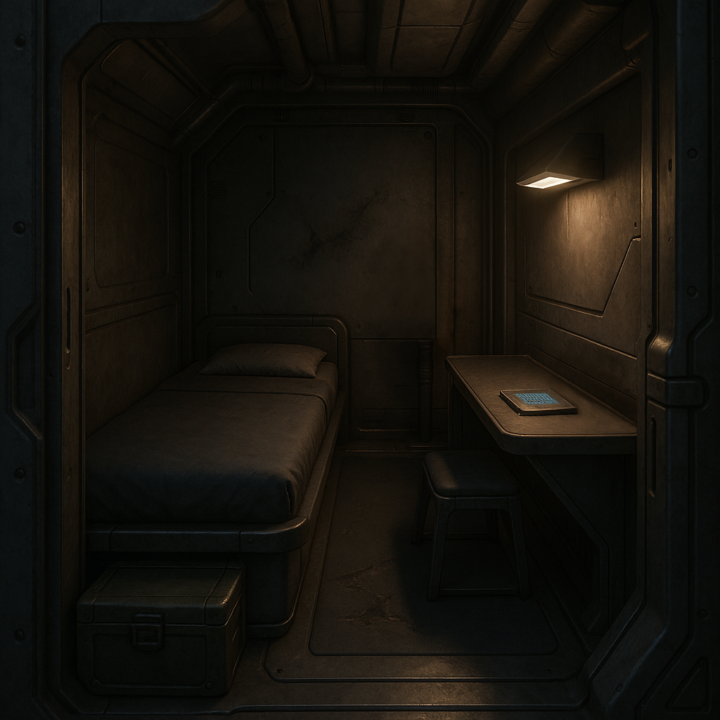 The central corridor houses six small, utilitarian passenger cabins, with a single bed and narrow desk space. The captain/pilot has their own cabin adjacent to the cockpit.