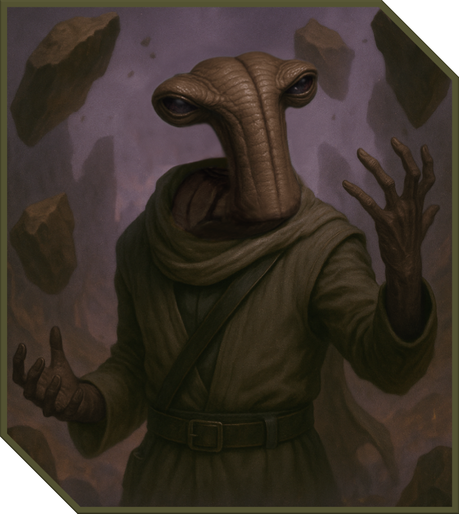 | Strengths & Weaknesses | Bomoor’s reserved nature does not make him a natural leader. However, he is an excellent mentor and friend – open to share his thoughts and teachings. Sometimes his firm beliefs cause conflict between those whose views differ which can cause problems, particularly with those in authority. Despite this, Bomoor usually finds some way to achieve his goals, even if in a small way. In combat, Boomor’s physiology makes him prone to tire easily if relying too heavily on lightsaber combat. He has a strong affinity for force manipulation in combat but must often play the defensive, particularly if battle has tired him. |